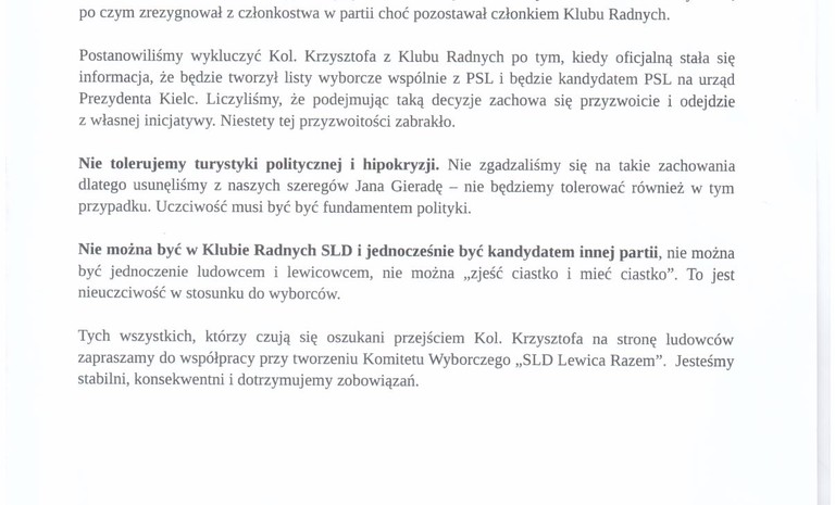 Oświadczenie SLD i KKW SLD Lewica Razem: